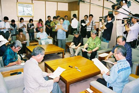これに反対する「基地の県内移設に反対する県民会議」は山内徳信共同代表ら30人が県庁を訪れ、牧野副知事に抗議を行いました。