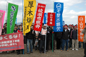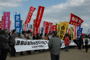 集会では、広島の空母艦載機移転反対期成同盟・副代表の中川洋大竹市長や、地元選出の民主党衆議院の平岡秀夫さん、社民党衆議院議員の保坂展人さんなどから連帯の挨拶がありました。また神奈川平和運動センター副代表の金子ときおさんが「厚木の爆音を岩国へ移すのは、たらいまわし。連帯し日本の基地強化を覆したい」と呼びかけました。