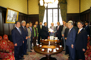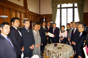 ●衆議院副議長室。横路孝弘副議長に署名を提出。