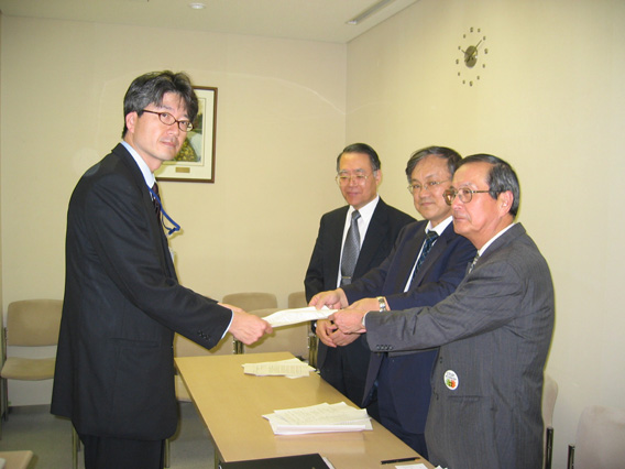 また、5月18日には、米海軍横須賀基地への原子力空母配備に反対する要請書を、石原慎太郎東京都知事に提出し、上記の3点を同様に強く要請しました。3団体からは「原発を首都圏ののど元である東京湾に持ってくるようなものである。原子力空母は原発以上に危険性が高い。被爆国として外務省、防衛庁にも要請していただきたい。」等を伝え、東京都からは「他県との連携の必要性や、施政方針について検討する」との回答を受けました。