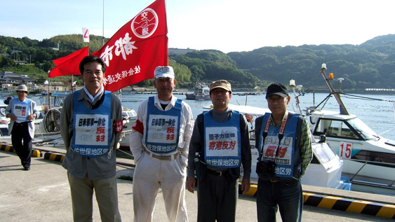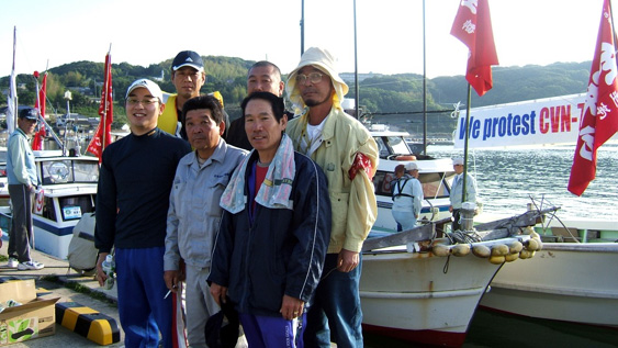 ●海上抗議行動の参加者。後ろに見えるのが、抗議船。