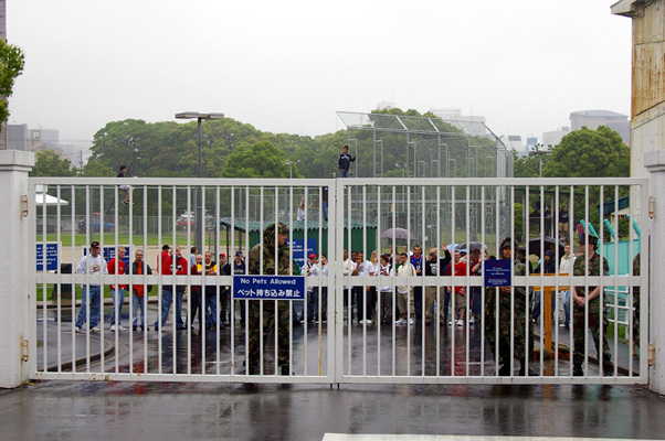 ●米軍基地の通用門前。上陸した「リンカーン」の乗組員たちが、集まってくる。