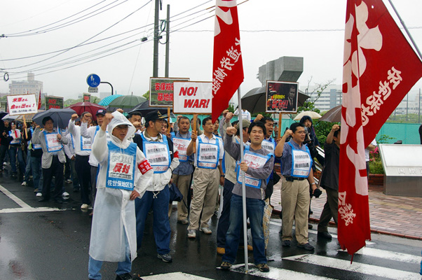 ●基地に向けてシュプレヒコールをあげる「全水道」の仲間たち。