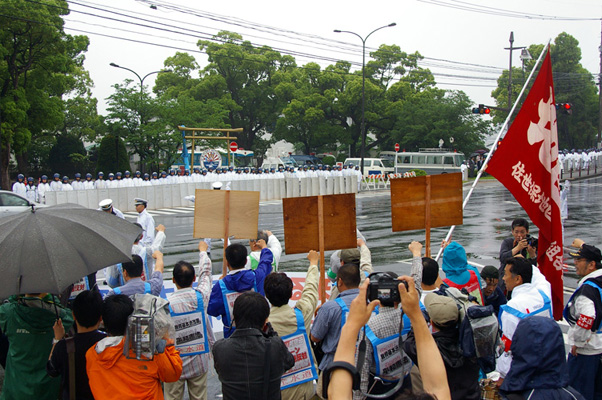 ●長崎県平和運動センターと佐世保現地闘争本部は5月27日、佐世保市内の島瀬公園で、「来るな!米原子力空母、許すな!米軍再編・日米軍事一体化5・27全国集会」を開催しました。集会には県内はもとより九州各県、全国各地から1250人が参加しました。参加者は集会終了後、米軍佐世保基地に向けてデモ行進を行いました。