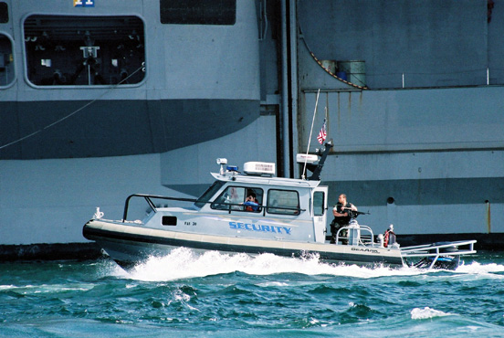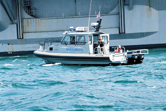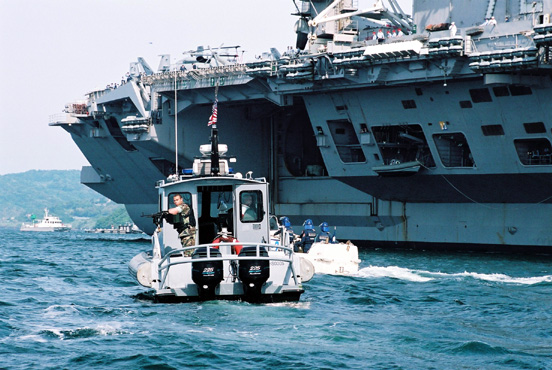 ●空母リンカーン(後ろ)を警備する米海軍の警備艇