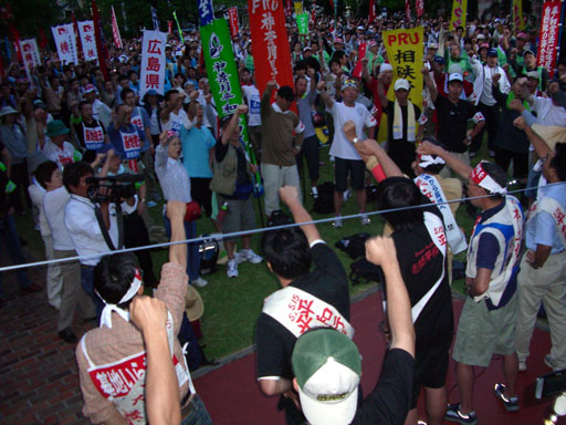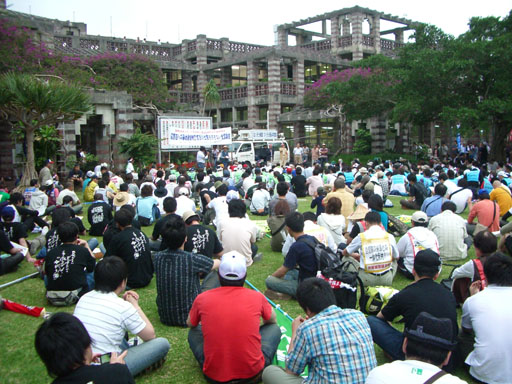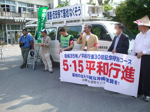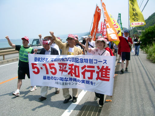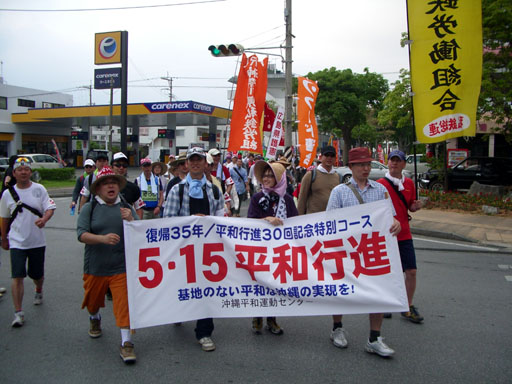 今年は沖縄の本土復帰から35周年、第1回目の平和行進から30周年をむかえます。そこで10日には、国頭から名護まで歩く特別行進が行なわれました。また13日には、沖縄平和運動センターを中心に県内の野党各党や労働団体が参加しての、普天間基地包囲行動が行なわれました。