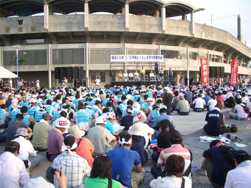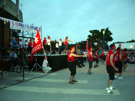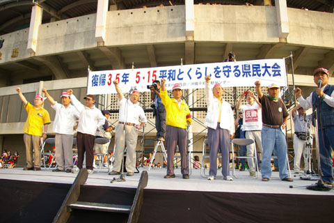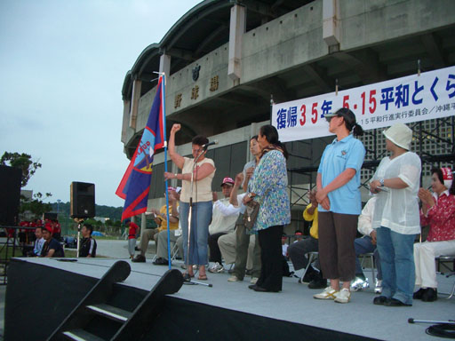 12日の夕方には、行進団が嘉手納基地に隣接する北谷町に到着。「平和と暮らしを守る県民大会」を開催しました。