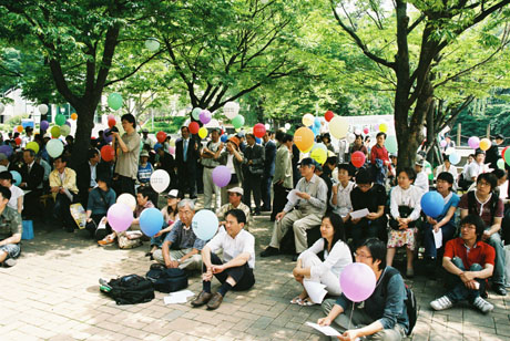●大学の中庭で閉会総会。
