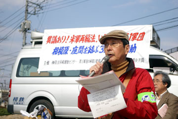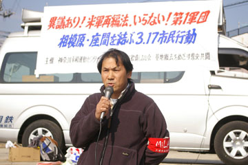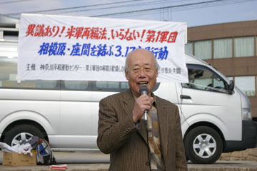 神奈川県の座間市で3月17日、「いらない!第1軍団 異議あり!米軍再編法 相模原と座間を結ぶ3/17市民行動」が行われました。主催は神奈川平和運動センター・第1軍団の移駐を歓迎しない会・基地撤去をめざす県央共闘会議・相模補給廠の返還を求める市民の会の4団体です。