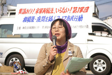 米軍再編も着々と進んでいます。たくさんの税金が米軍再編につぎ込まれます。しかし皆さん、格差社会が広がる中で、米軍にお金をつぎ込むことが許されるでしょうか。米軍再編は、日本が米国の世界戦略に組み込まれるだけではなく、私たちの暮らしと税金に密接にかかわることなのです。防衛省への昇格で、防衛費の増額も進むでしょう。税金の使われ方に注視しなければなりません。また座間では、米陸軍第1軍団と陸上自衛隊中央即応集団が一体となります。横須賀では、米海軍と海上自衛隊が一緒に活動しています。横田基地では、米空軍司令部と航空自衛隊司令部が一体になります。国道16号線の沿線で、日米の軍事一体化が進行しています。私たちの力で、米軍再編を止めましょう。