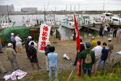 ●港の埠頭で抗議行動を行う仲間たち。140人が参加しました。