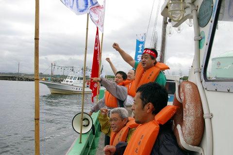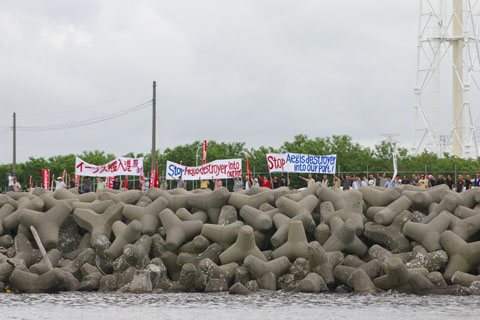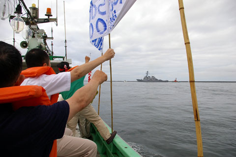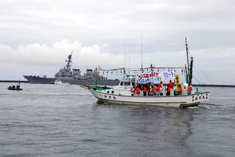 イージス艦入港の情報を得た新潟県平和運動センターは、新潟港の管理権を持つ県知事に対して入港を認めないように要請すると共に、入港当日には抗議行動を行いました。埠頭付近で行った陸上での抗議行動には約140人が参加。「新潟港の軍事利用反対」の声を上げました。また海上ではチャーター船3隻に約40人が搭乗して、イージス艦に肉薄しての抗議行動を行いました。