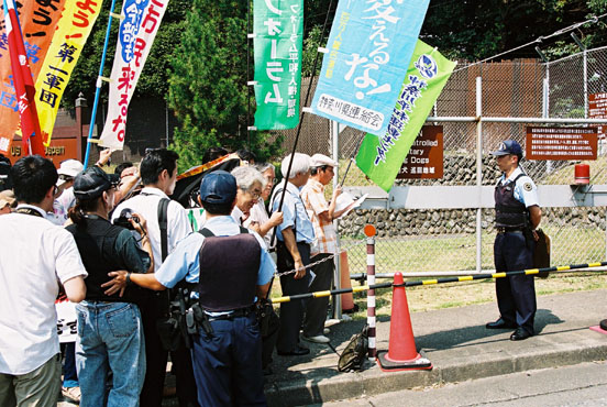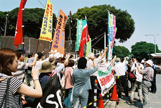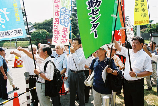在日米軍再編に関して日米政府は、現在は米本土ワシントン州にある陸軍第1軍団司令部を、キャンプ座間に移転することで合意しました。しかしキャンプ座間がある座間市と相模原市では、行政・議会・市民の3者ともに、司令部移転に反対しています。こうした中で8月14日に横浜防衛施設局の高見澤局長が座間市・相模原市・神奈川県を訪れ、新司令部の分遣隊(約30人)が8月20日前後に、キャンプ座間内で発足することを伝えてきたのです。今回の行動は、行政や市民の声を無視して新司令部設置を進める米軍に対して、抗議するためのものです。