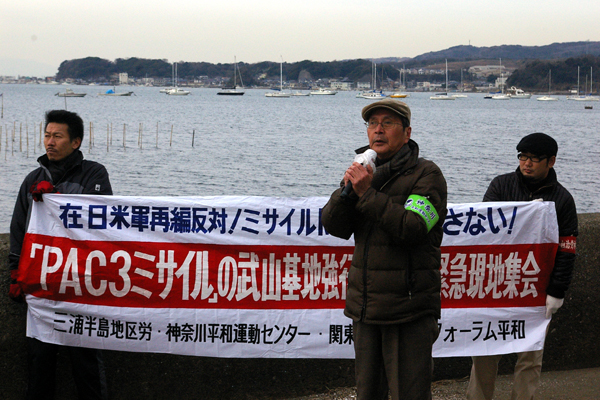 三浦半島地区労と神奈川県平和運動センターは2月2日、自衛隊武山基地に隣接する富浦公園で、「PAC3ミサイルの武山基地強行搬入反対、抗議行動」を開催しました。この行動には、神奈川県内の労組・市民団体をはじめ、平和運動センター関東ブロック、平和フォーラムなどから100人が参加しました。