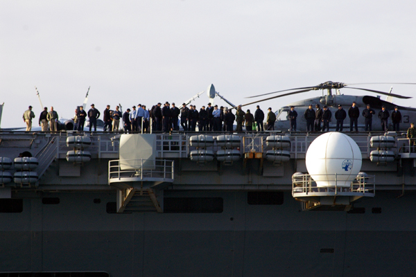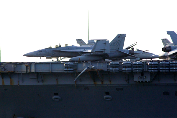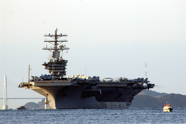 ●湾内に姿をあらわした原子力空母「二ミッツ」。