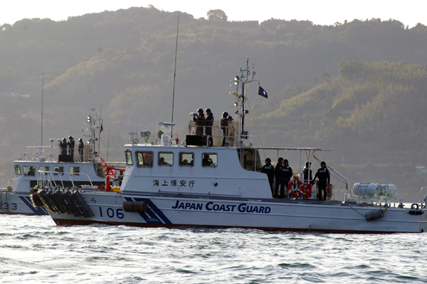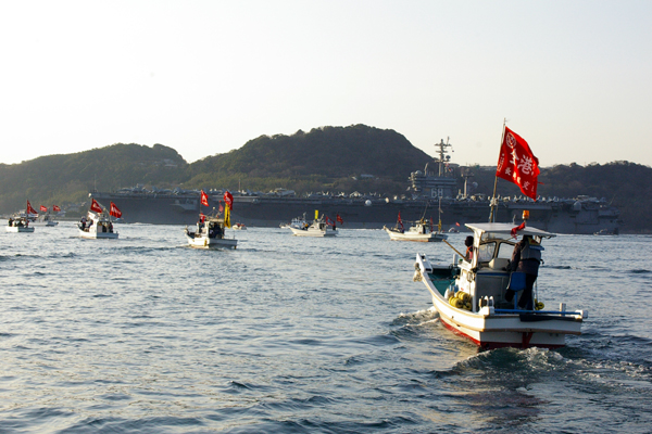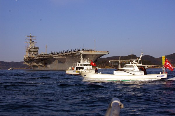 ●原子力空母の周りでは、海上保安庁の船舶が厳重な警備を敷いています。