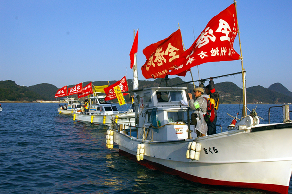 ●早朝6時30分。俵ヶ浦ふ頭に、抗議船団が集まってきました。