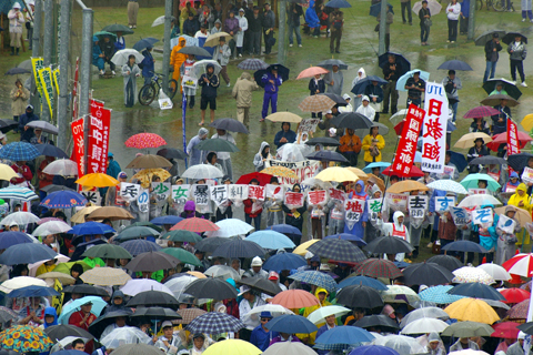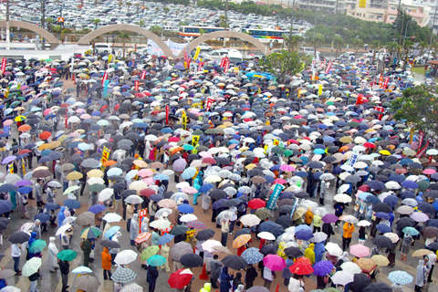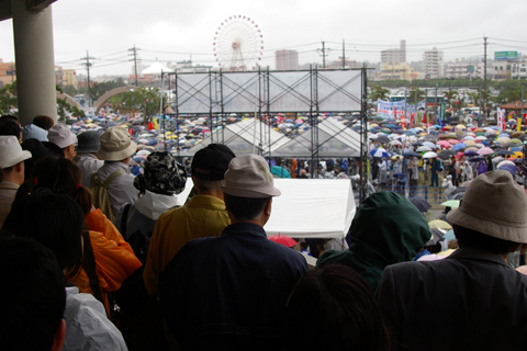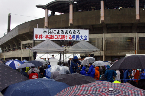 ●県民大会の会場になった北谷公園野球場前広場。どしゃ降りの中、6000の人びとが日米両国政府への抗議をあげました。