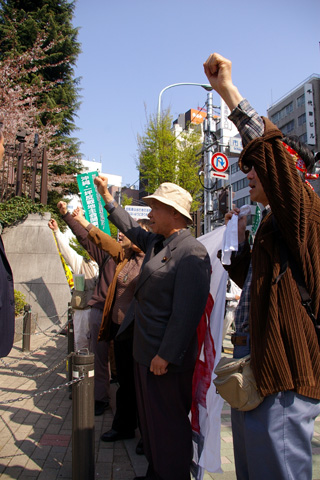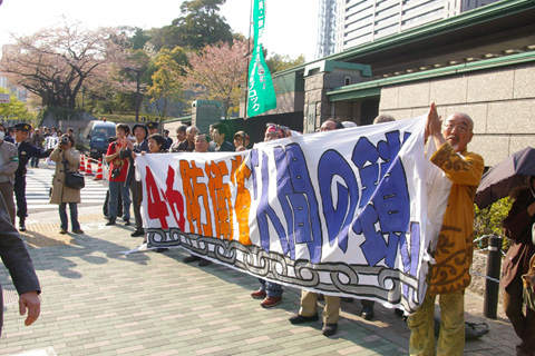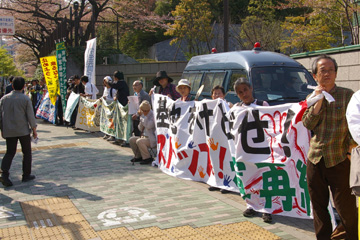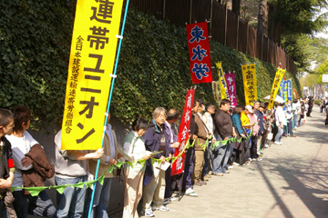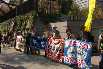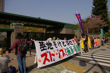 4月6日(日)午後、東京都・防衛省前で、「基地をけとばせ!ストップ米軍再編 4・6防衛省『人間の鎖』」が行われました。この行動を主催したのは、ヘリ基地反対協議会・沖縄平和市民連絡会・辺野古への基地建設を許さない実行委員会の3団体です。呼びかけに応じて、各地から550人が集まりました。