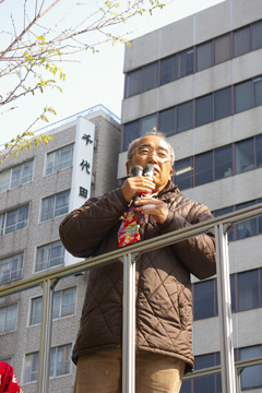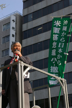 参加者は、14時45分、15時、15時15分の3回にわたって、防衛省を人間の鎖で包囲しました。また包囲行動の途中では、安次富浩さん(ヘリ基地反対協議会)、高里鈴代さん(沖縄平和市民連絡会)、田村順玄さん(住民投票の成果を活かす岩国市民の会)、木元茂夫さん(すべての基地にNO!を・ファイト神奈川)、原順子さん(バスストップから基地ストップの会)が、米軍基地に反対する各地の運動について訴えました。