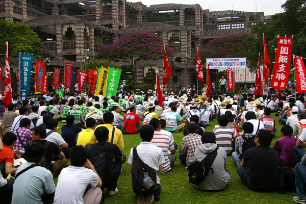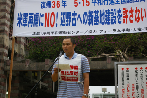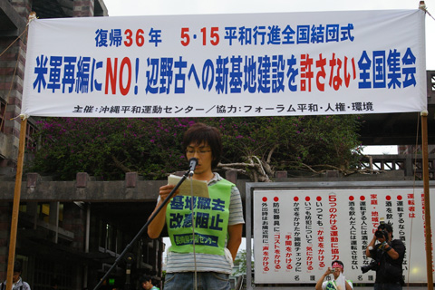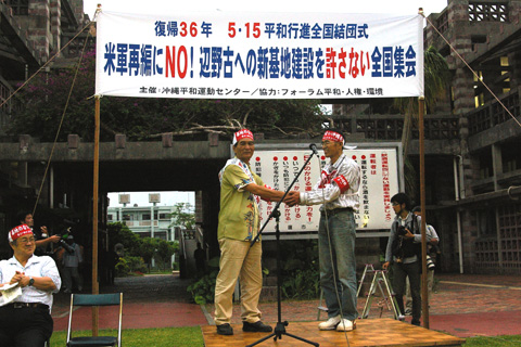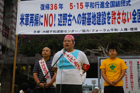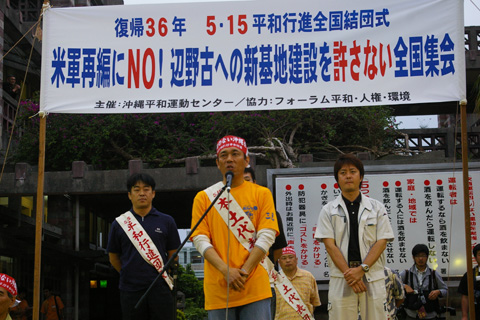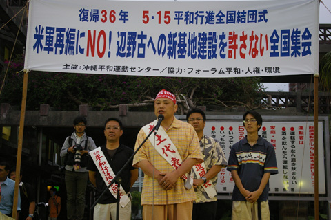●5月15日(木)午後6時から、名護市役所前で、「復帰36年5・15平和行進結団式――米軍再編NO!辺野古への新基地建設を許さない全国集会」が開かれました。本土各地からの参加者は、那覇空港から名護市にバスで直行して集会に参加しました。