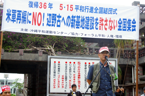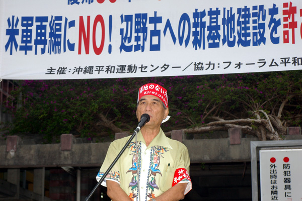 ●主催者を代表してあいさつする、沖縄平和運動センター議長の崎山嗣幸さん。「3日間の行進で、米軍基地の集中する沖縄の現状を明らかにし、平和運動を広げていきたい」と訴えました。