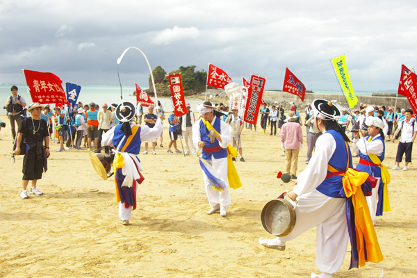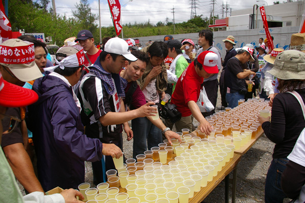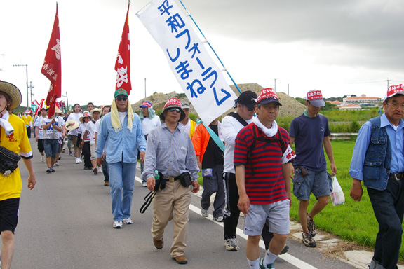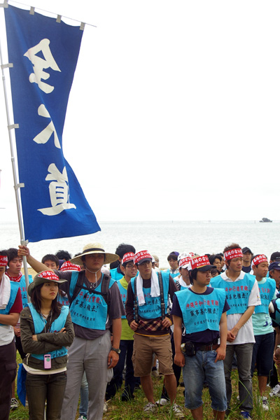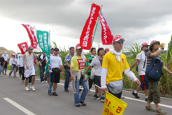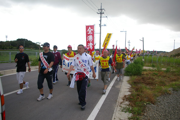 ●東コースの1日目は、ヘリ基地建設が強行されようとしている、名護市・辺野古から出発です。韓国の民族舞踊グループ「トヌム」の踊りが、出発式を盛り上げてくれました。