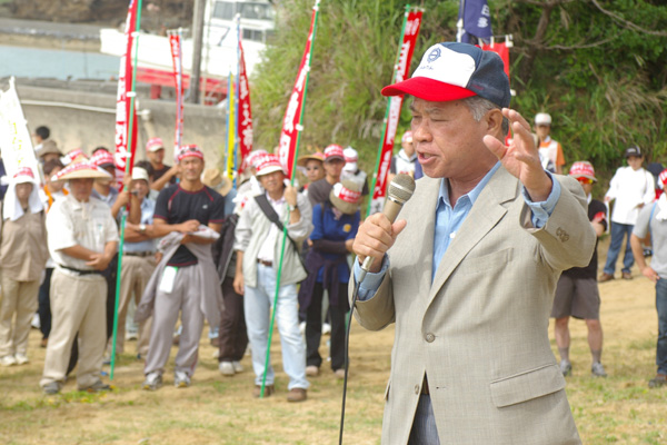 ●参議院議員の山内徳信さんが、辺野古の現状について話してくれました。山内さんは、参議院議員に当選される前は、基地の県内移設に反対する県民会議の共同代表として、ここ辺野古の地で闘ってきました。