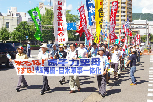 この集会は、翌日7月28日に予定された、米海軍原子力空母ロナルド・レーガンの、米海軍佐世保基地への入港に反対するためのものです。原子力空母の佐世保入港は、1968年以来10回目で、今年は2月のニミッツに続いて2回目です。