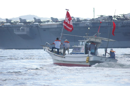 レーガンは9時過ぎに入港してきました。全長が330メートルもある、約40キロで走る原子力空母は、動く島のようです。抗議船団の漁船やレジャーボートとは、まるで大きさが違います。その原子力空母が起こす波に負けないように、抗議船団は空母に近づき、力強くシュプレヒコールをあげました。