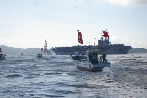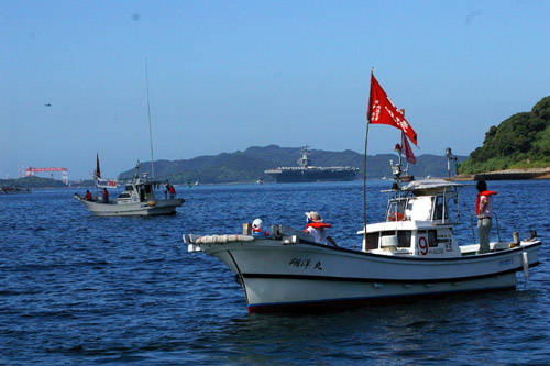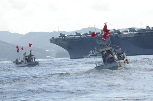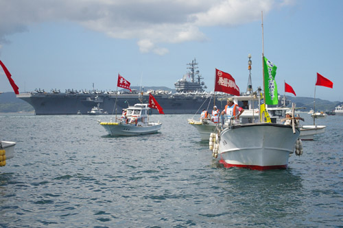 ●停泊し投錨した空母と、取り囲む抗議船団。