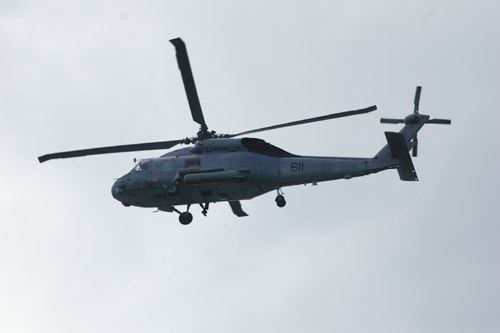 ●上空では、空母から離陸したヘリコプターが警戒しています。