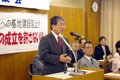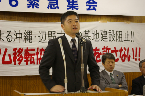 私は先週、平岡秀夫議員と一緒に沖縄に行ってきました。現実を考えれば、普天間基地の周辺に住む人々の方が、よっぽど危険でしょう。また「流弾注意」と書かれた看板のそばに住んでいる金武町伊芸区の住民の方が危険です。辺野古の移転について反対決議を出した県議会の皆さんを、あざ笑うかのように、クリントン米国務長官と中曽根外務大臣は、移転協定にサインしました。その前文には、沖縄県を含む地域社会の負担を軽減しと書かれています。いったいどこが、軽減になるのでしょうか。日本を守ってもいない海兵隊のグアム移転は、米国にとっての負担軽減にはなるでしょう。しかし沖縄の負担軽減にはなりません。この協定には、断固反対をしていかなければなりません。民主党の部門会議でも、圧倒的に反対でまとまっています。ただ民主党全体は、すこし図体が大きいですから、はっきりと反対になるのにはやや時間がかかりますが、反対でいけると思います。