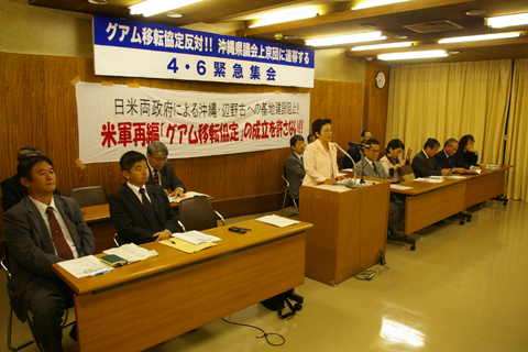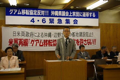 グアム移転協定に対して、沖縄県内では大きな反対の声が沸き起こりました。そうした中で沖縄県議会は3月25日、グアム移転協定に反対する意見書を賛成多数で可決しました。この意見書を政府や国会に届けるために4月6日・7日の両日、沖縄県議会から5人が上京しました。また県議会上京団を激励するために、「基地の県内移設を許さない県民会議」の構成団体からも上京団がやってきました。そこで県議会・県民会議の上京団と連帯するために、緊急集会を開催することになったのです。