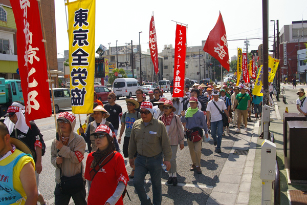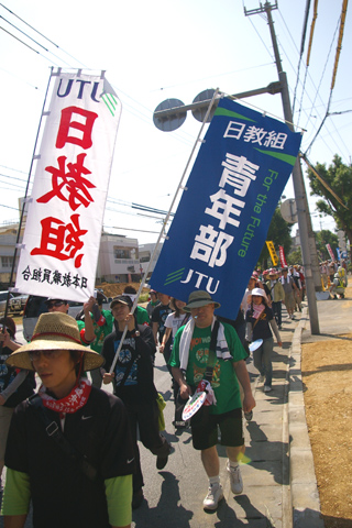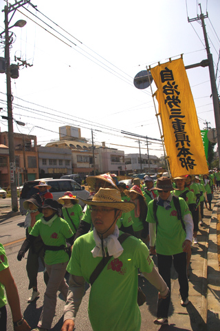| 大分高教組・青年部のみなさん。寄せ書きを持っての行進です。 |
