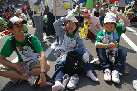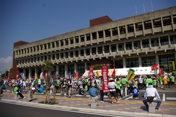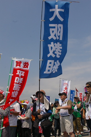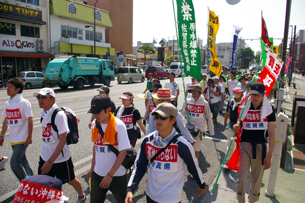 | 赤字に白抜きで「基地いらない」のゼッケンは、佐賀県からの参加者です。 |