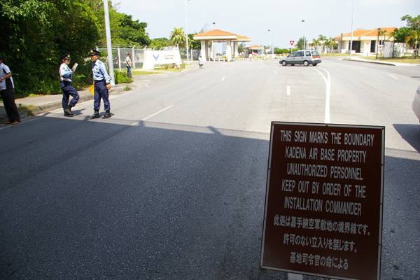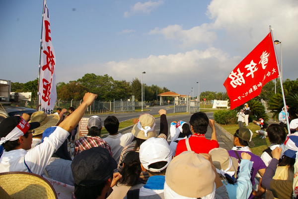 | 嘉手納基地・第1ゲート前。基地撤去のシュプレヒコールを繰り返しました。 |