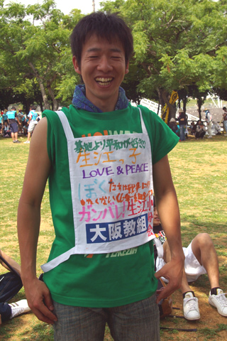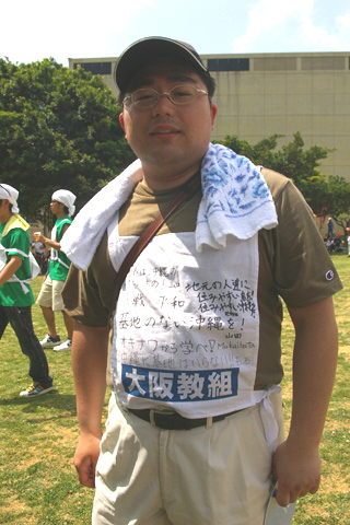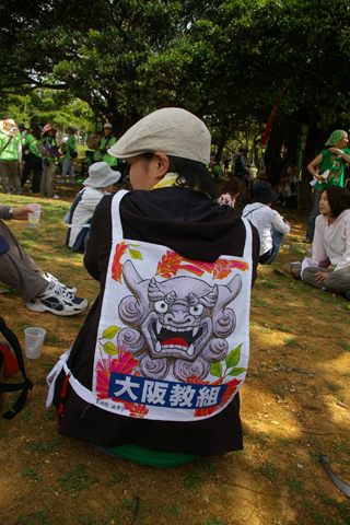 大阪教組のみなさんは、白地のゼッケンに自分で文字を書いています。