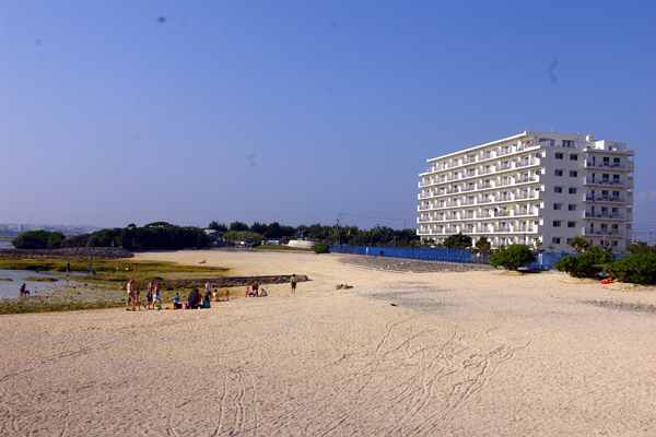| ここは嘉手納基地に隣接している北谷町・砂辺区です。右側に見えるマンションは、基地外に居住する米兵・家族向けのものです。プライベートビーチのような海岸で遊んでいるのも、米軍関係者のようでした。 この海岸は、沖縄戦のときに米軍の上陸地点となった場所です。 |