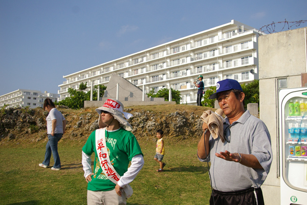 | 地元選出の県議会議員・瑞慶覧功さん。北谷に米軍住宅が集中し、地域にさまざまな問題が発生している状況を話してくれました。 |