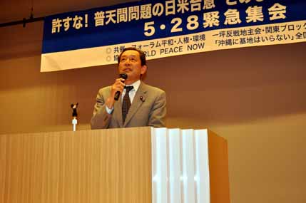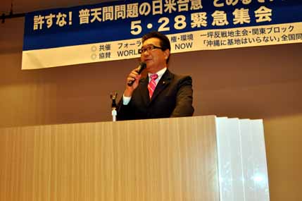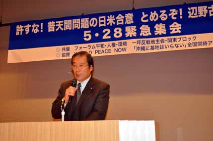 昨日、官邸にまいりまして、181名の署名で、県外・国外移設を政府の方針にするべきと申し入れをしてきました。私たちは最後まで絶対にあきらめない。私たちの気持ちも、沖縄の人たちの気持ちも、辺野古では絶対にだめだといっているのです。だめだといっているのに、なぜ作るのでしょうか。地元とも合意、日米の合意、3党の合意が必要といってきたはずです。それがそろわなければ、だめなのです。辺野古ではだめ、国外移設、軍備はいらないということで、皆さんといっしょにがんばっていきます。ありがとうございます。
