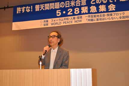 平和フォーラムは5月28日に東京・千代田区の全電通労働会館ホールで、「許すな!普天間問題の日米合意 とめるぞ!辺野古新基地建設 5・28緊急集会」を開催しました。集会の開催に当たっては、「沖縄・一坪反戦地主会 関東ブロック」に共催として、「沖縄に基地はいらない 全国同時アクション」、「WORLD