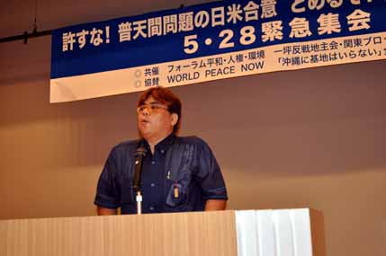 ゴールデンウェークのさなかに、鳩山総理が沖縄を訪れました。「沖縄に負担をお願いするかもしれない」といいました。その時には、「総理、違うでしょう、沖縄の声を聞いてください」という趣旨で、県庁前で総理を出迎えてアピールしました。それから1月も経たないうちに鳩山総理は沖縄を再訪しました。その鳩山総理が同じ口でいったことは、自民党が作り民主党が否定してきた案に戻ることでした。「辺野古に基地は作らせない」、「最低でも県外」といってきた鳩山総理の思いを感じることはできませんでした。5月4日には「鳩山首相、民意を受け取れ」と投げかけた言葉が、23日には怒りの声に変わっていました。でも私たちは、まだまだあきらめてはいません。二転三転する政府の方針に対して怒りの声を上げることは、決してあきらめではありません。総理が何を言おうと、日米政府が何を合意しようと、私たち沖縄に住む人間の辺野古に住む人たちの思いを無視して基地を作ることはできないし、1本の杭も打つことはできないと思っています。この場にお集まりになった皆さんも、同じ思いであるとおもいます。誰一人として、沖縄に同情して集まってきたわけではないでしょう。