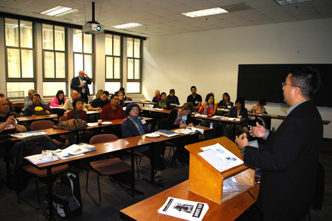 会議は全体会と分科会に分かれて行われ、米本土・グアム・ハワイ・欧州・南米・アジア太平洋から報告が行われました。米国の参加者からは、@オバマ大統領の誕生によってイラクからの兵力撤退は進むが大きな軍事政策の転換はいまのところ期待できない、Aしかし社会保障政策の充実などをすすめるためには海外基地の閉鎖が必要である、B大統領選挙でオバマに投票した人々に海外基地の閉鎖に関心を持ってもらうためにインターネットなどを利用した独自の情報発信が重要である、C政策転換を実現するには上下両院の議員に対する日常的なロビー活動が必要である――などが述べられました。