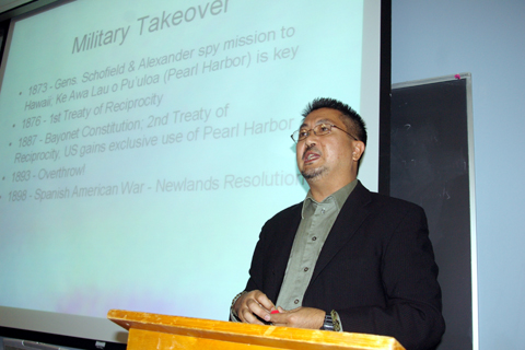 ハワイの先住民にとって、土地は先祖からのつながりを示すものです。しかし土地や海は、基地からの汚染にさらされています。いまオアフ島の4分の1が軍事基地です。ハワイの総人口は1250,000人ですが、米軍は160か所の基地に、44,458人の軍人と、56,572人の軍人家族が住んでいます。文化や教育の面での軍事化が進んでいます。青年たちは、将来を自分で決める力を奪われています。土地は米軍に奪われ、そこに爆弾が置かれているのです。