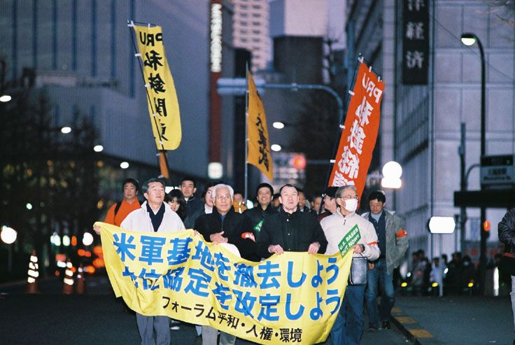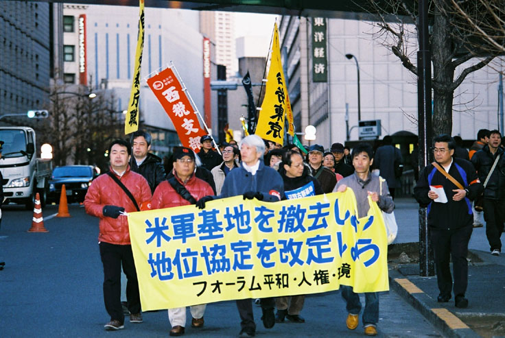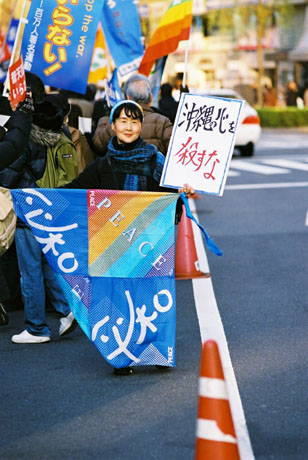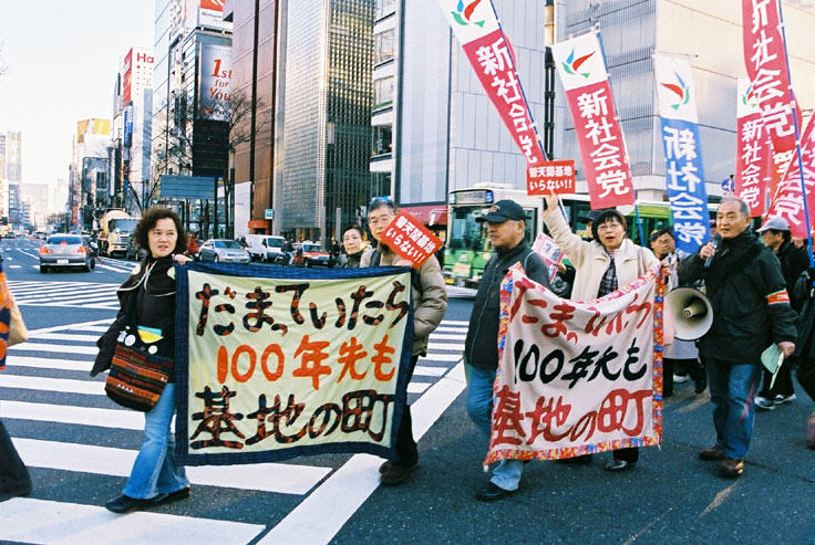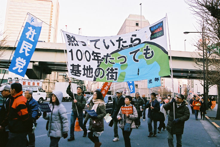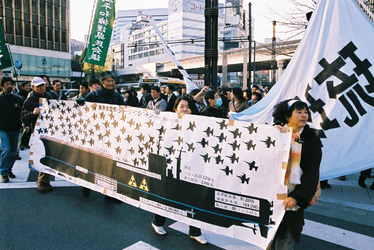 一昨年に米海軍横須賀基地に配備された、原子力空母「ジョージ・ワシントン」の攻撃性能を書いた横断幕をもって行進です。