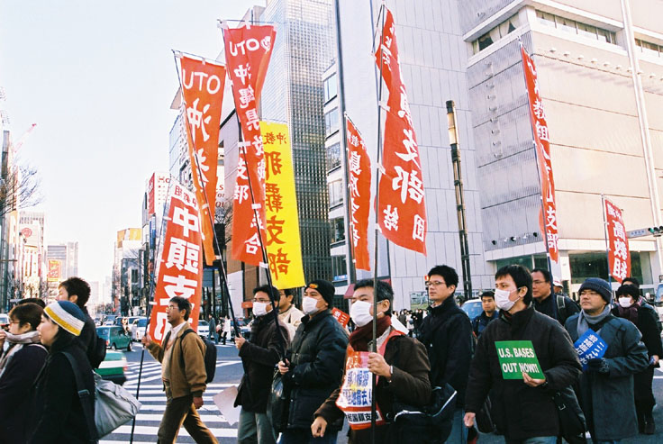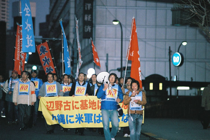 集会終了後に、参加者全員でデモ行進を行いました。6000人が参加したデモは、全部で15連にも及びました。デモ行進のコースは、日比谷公園「中幸門」〜外堀通り〜銀座〜東京駅前〜常盤橋公園です。買い物客でにぎわう銀座の街に、「普天間基地はいらない!」、「米軍は沖縄から出て行け!」のシュプレヒコールが響き渡りました。以下はデモ行進の様子です。