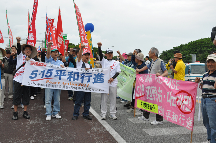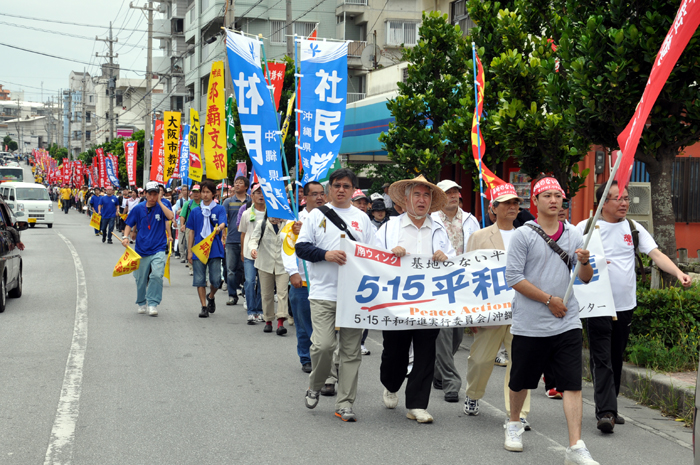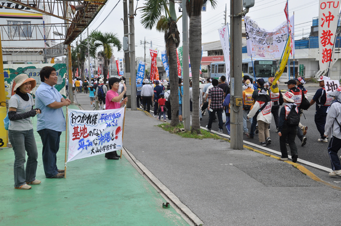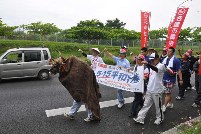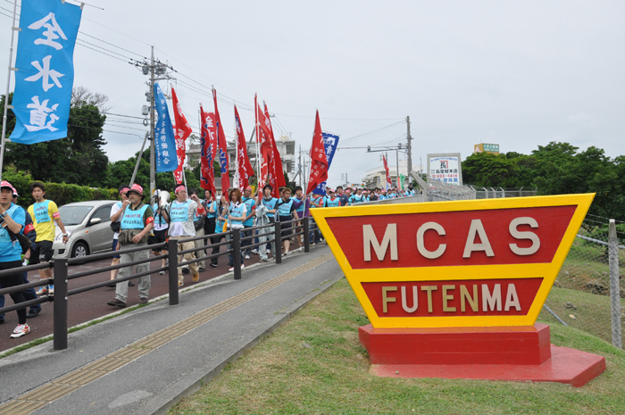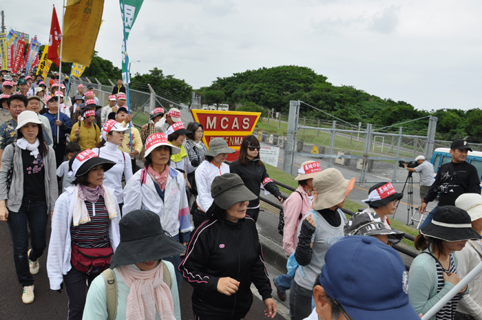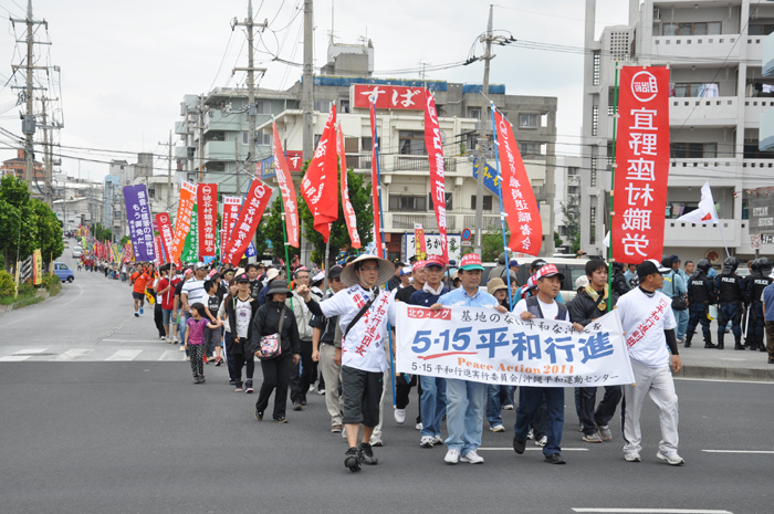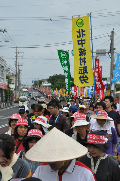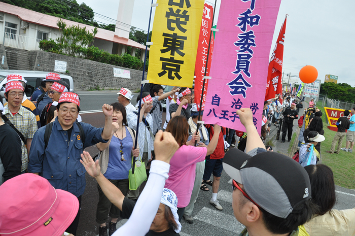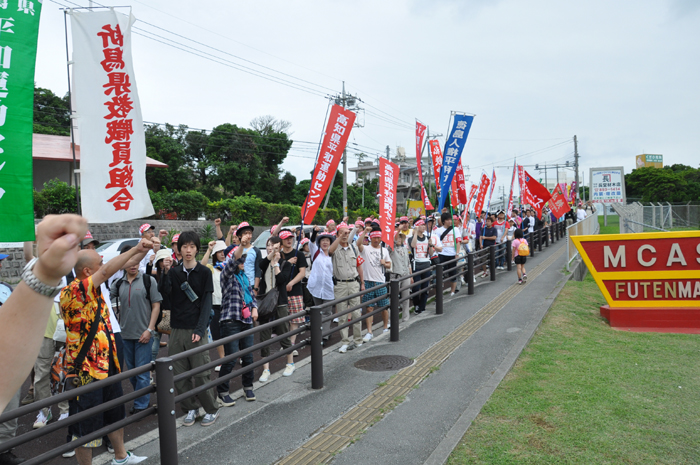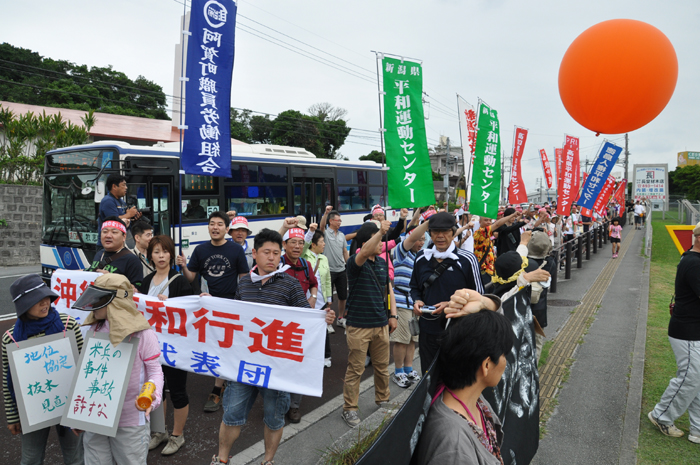 北ウィングの行進 ●北ウィングは、普天間基地第3ゲート前、普天間三叉路、大山交差点前などを経由して、6.5キロの道を歩きます。 北ウィングの先頭は、前宜野湾市長の伊波洋一さんと、沖縄平和運動センター事務局長の山城博治さんです。さすが、伊波さんが先頭を歩いていると、多くの市民から声がかかりました。 ●お子さんづれの参加者もたくさんいました。 ●こちらは、第3次嘉手納基地爆音訴訟団の皆さんです。第3次訴訟には、2万人を超える住民が参加しています。爆音訴訟史上最大の原告団です。 ●1500人以上のデモ隊が、1ていだんで行進します。 写真では分かりにくいですが、道路の端までデモ隊が続いています。 本土のデモでは見る事が出来ない、勇壮な光景です。 ●行進団が、普天間基地第3ゲートの前に到着しました。 ●基地の中には、いつもよりも多い海兵隊員と、日本人警備員がいました。 ●普天間基地爆音訴訟団や沖縄の市民団体、また韓国からの反基地運動訪問団が、ゲート前で行進団を出迎えてくれました。 ●平和行進団と市民団体の皆さんが、「普天間基地はいらない!」のシュプレヒコールで、エールを交換します。 ●韓国語の幕を持っているのは、「済州軍事基地阻止および平和の島実現のための汎道民対策委員会」執行委員長のホン・ギリョンさんです。平和の島、観光の島のイメージがある済州島では、韓国海軍の基地建設が進もうとしています。海軍基地が建設されれば、当然、米海軍も駐留することになります。済州島の基地建設反対は、現在の韓国の平和運動の大きな焦点です。 ●今年の4月12日、「カマドゥー小たちの集い」や普天間基地爆音訴訟団のメンバーが、普天間基地の周辺で大きな風船をあげました。これによって、普天間基地の飛行機は訓練を中止せざるを得ませんでした。右端に見えるオレンジ色の風船が、その時のものです。 ●沖縄高教組の皆さん。手書きのゼッケンで行進です。 ●こちらは、新潟を先頭に、県外からの参加者の皆さん。徳島や高知の旗が見えます。 ●ゲート前でシュプレヒコール。 ●こちらは東京・三多摩からの皆さんです。 ●全水道の皆さん。 ●行進の途中で、自治労・読谷村職労の皆さんが、飲み物をふるまってくれました。 ●こちらは、県教組の方ですかね。 ●なぜか、途中に牛が待機。 ●デモ行進に合流しました。 ●北ウィング行進団が、海浜公園前の交差点に到着です。 ●ほどなくして、南ウィングも到着しました。さあ、これから県民大会です。 part4に続く。 |