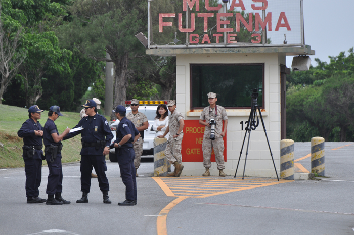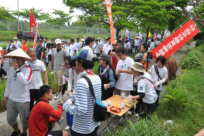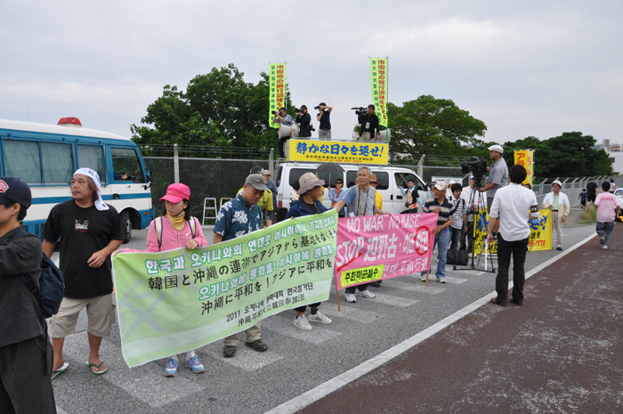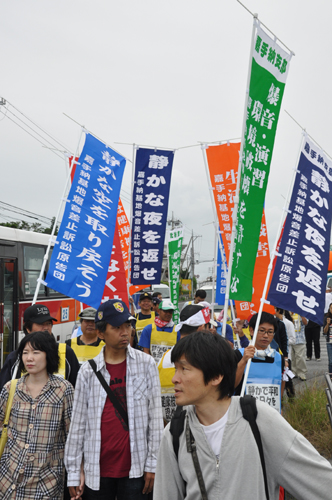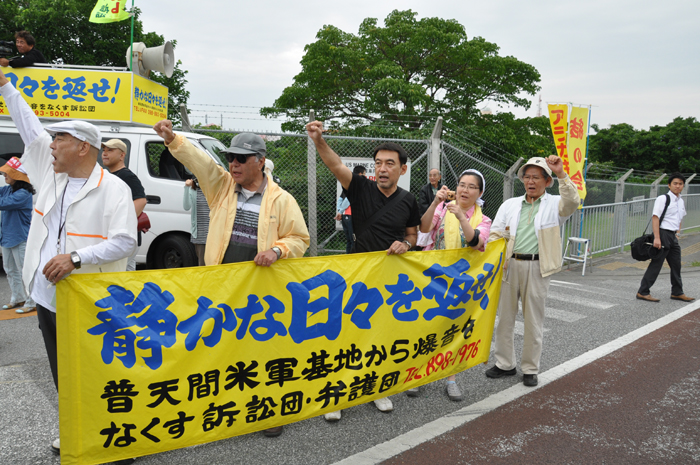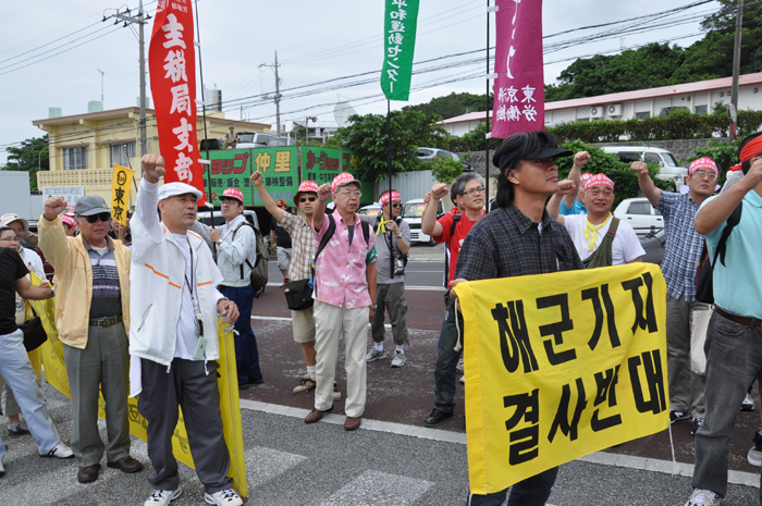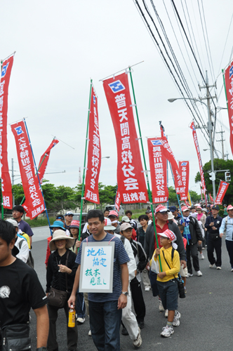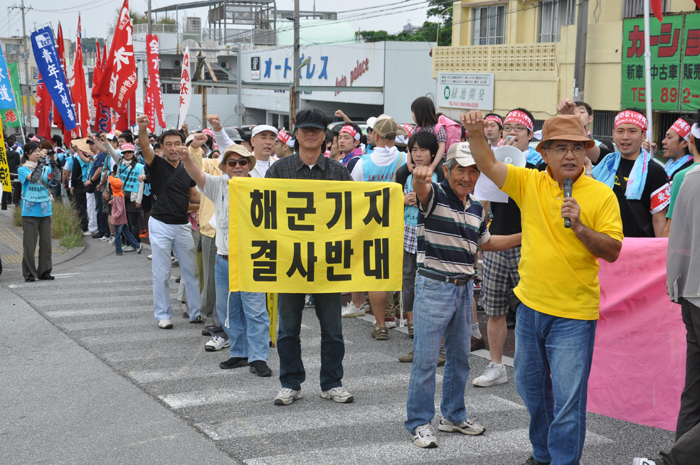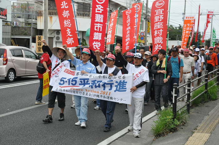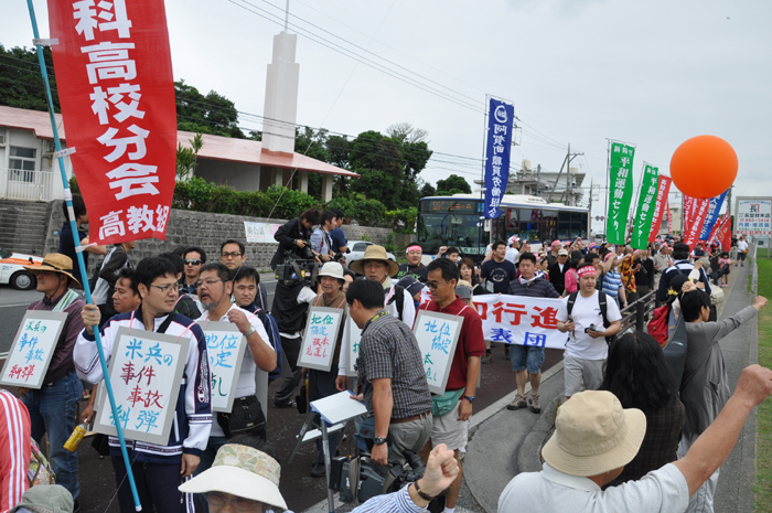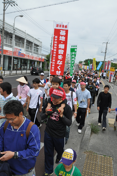 北ウィングの行進 ●北ウィングは、普天間基地第3ゲート前、普天間三叉路、大山交差点前などを経由して、6.5キロの道を歩きます。 北ウィングの先頭は、前宜野湾市長の伊波洋一さんと、沖縄平和運動センター事務局長の山城博治さんです。さすが、伊波さんが先頭を歩いていると、多くの市民から声がかかりました。 ●お子さんづれの参加者もたくさんいました。 ●こちらは、第3次嘉手納基地爆音訴訟団の皆さんです。第3次訴訟には、2万人を超える住民が参加しています。爆音訴訟史上最大の原告団です。 ●1500人以上のデモ隊が、1ていだんで行進します。 写真では分かりにくいですが、道路の端までデモ隊が続いています。 本土のデモでは見る事が出来ない、勇壮な光景です。 ●行進団が、普天間基地第3ゲートの前に到着しました。 ●基地の中には、いつもよりも多い海兵隊員と、日本人警備員がいました。 ●普天間基地爆音訴訟団や沖縄の市民団体、また韓国からの反基地運動訪問団が、ゲート前で行進団を出迎えてくれました。 ●平和行進団と市民団体の皆さんが、「普天間基地はいらない!」のシュプレヒコールで、エールを交換します。 ●韓国語の幕を持っているのは、「済州軍事基地阻止および平和の島実現のための汎道民対策委員会」執行委員長のホン・ギリョンさんです。平和の島、観光の島のイメージがある済州島では、韓国海軍の基地建設が進もうとしています。海軍基地が建設されれば、当然、米海軍も駐留することになります。済州島の基地建設反対は、現在の韓国の平和運動の大きな焦点です。 ●今年の4月12日、「カマドゥー小たちの集い」や普天間基地爆音訴訟団のメンバーが、普天間基地の周辺で大きな風船をあげました。これによって、普天間基地の飛行機は訓練を中止せざるを得ませんでした。右端に見えるオレンジ色の風船が、その時のものです。 ●沖縄高教組の皆さん。手書きのゼッケンで行進です。 ●こちらは、新潟を先頭に、県外からの参加者の皆さん。徳島や高知の旗が見えます。 ●ゲート前でシュプレヒコール。 ●こちらは東京・三多摩からの皆さんです。 ●全水道の皆さん。 ●行進の途中で、自治労・読谷村職労の皆さんが、飲み物をふるまってくれました。 ●こちらは、県教組の方ですかね。 ●なぜか、途中に牛が待機。 ●デモ行進に合流しました。 ●北ウィング行進団が、海浜公園前の交差点に到着です。 ●ほどなくして、南ウィングも到着しました。さあ、これから県民大会です。 part4に続く。 |