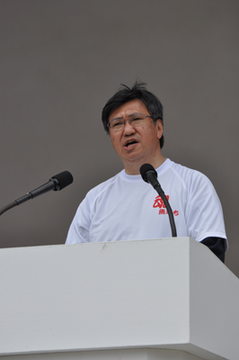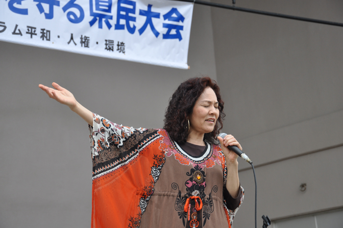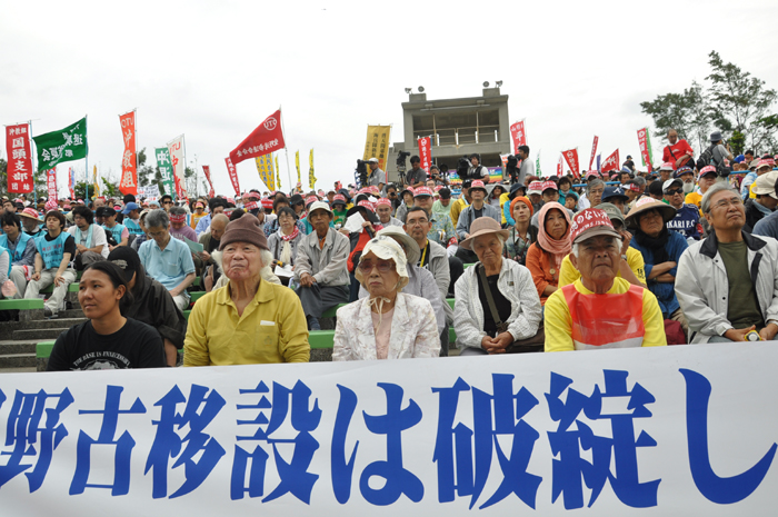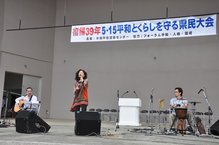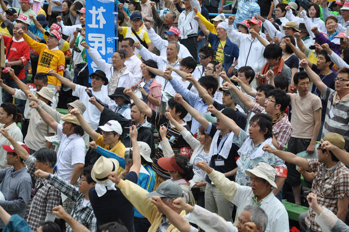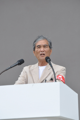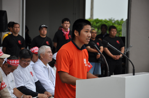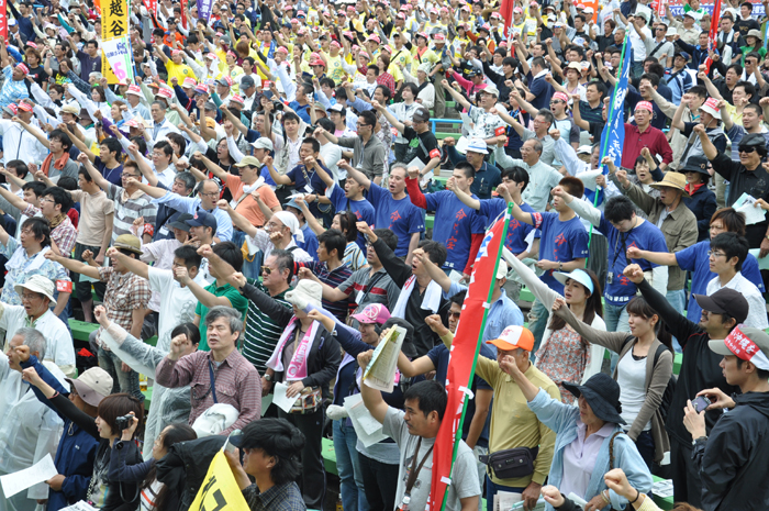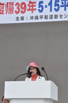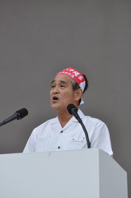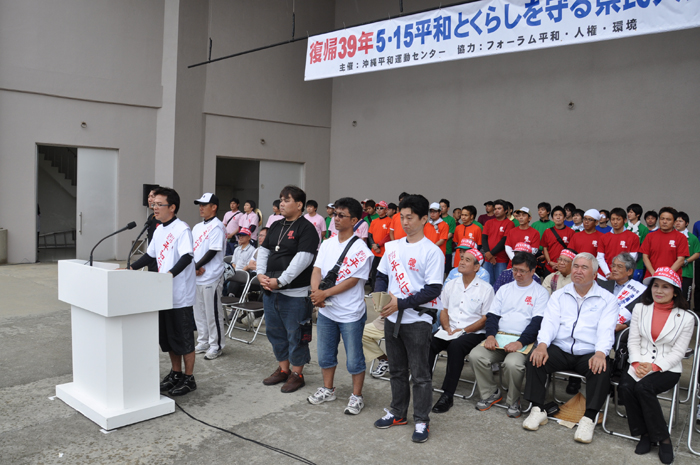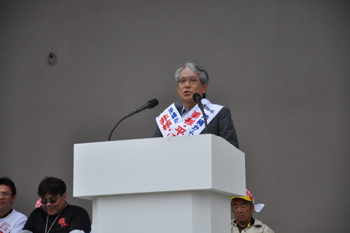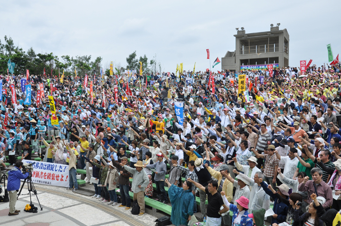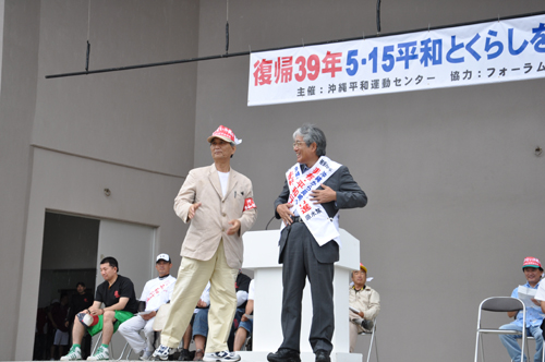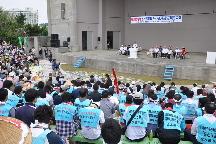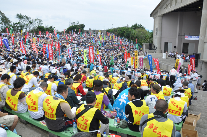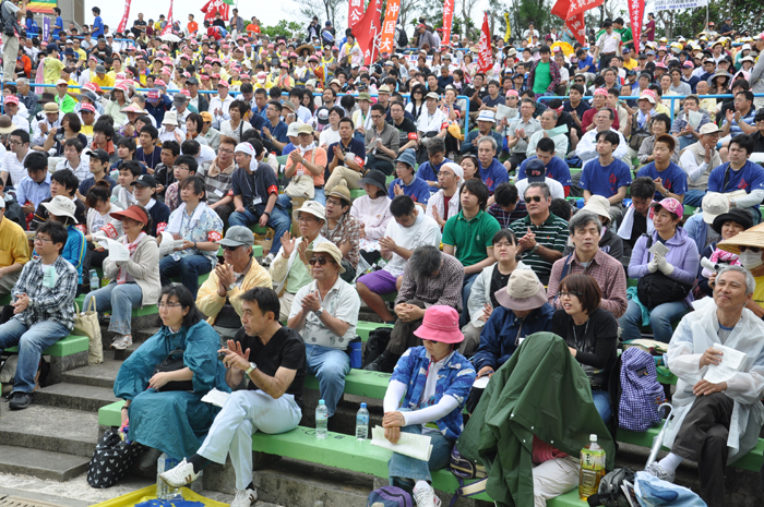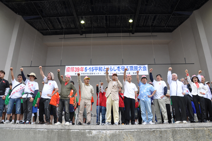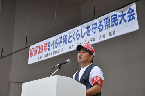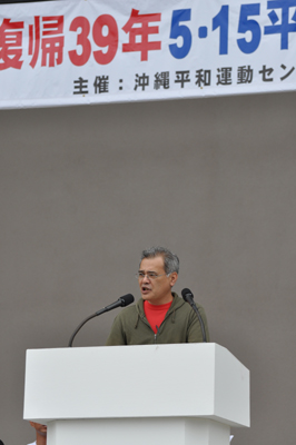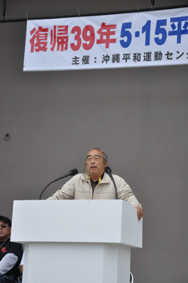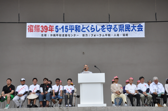 復帰39周年 5・15平和とくらしを守る県民大会 ●県民大会のオープニングは、「アコースティックM」の皆さんです。 ●会場の宜野湾海浜公園野外劇場は、いつもの年と同じように満杯になりました。 ●全員のシュプレヒコールで、集会が始まります。 ●司会 山城博治さん(沖縄平和運動センター事務局長) 今回の大会は、去る3月11日の大震災の発生を受けて、全国募集を中止し、私たちも全国の仲間と手を合わせて、震災の復興支援に最大の力を傾注することを確認しました。そのため今年は、県内の労働組合を中心に1日のみの行進とすることにして、とりくんできました。 参加者の数が心配でしたが、両コースの行進が3000人を超えて、実行委員会の心配をはねのけて大成功を収めました。まずそのことを確認したいと思います。 南ウィング1500人、北ウィング1700人、合わせて3200人を超える大行進として成功しました。心から感謝を申し上げます。ありがとうございました。 ●主催者あいさつ 崎山嗣幸さん(沖縄平和運動センター議長・沖縄県議会議員) 「5・15平和とくらしを守る県民大会」に参集された皆さん、大変ご苦労さまです。本日は沖縄が復帰して、39年目を迎えます。今回は、平和行進は本日1日のみです。早朝から宜野湾市役所に結集して、北から南から普天間基地を包囲して、「普天間基地を返せ」という思いで平和行進を貫徹して、この会場に到着しました。早朝から行動に参加された皆さんに、心から敬意を表します。ともにがんばりましょう。 皆さん。沖縄は復帰してから39年が経ったにも関わらず、憲法の下における基本的人権や平和的生存権が、脅かされ続けています。嘉手納基地や普天間基地のすさまじい爆音、米軍兵士による犯罪などが、限りなく起きています。日本国民でありながら、私たちからは法の下における平等が失われています。私たちはいまこそ、基本的人権や平和的生存権を全国民に訴え、この沖縄における不平等な条約に対して、断固として闘っていかなければなりません。 いま日本政府は、普天間基地を、辺野古へ回帰させたり、あるいは県内における移設先を物色したりするなど、沖縄県民に対する背信行為を繰り返しています。「5・15県民大会」を成功させて、普天間基地を即時閉鎖・返還させる運動を強めていかなければなりません。 日本政府は新防衛計画大綱で、先島に自衛隊の配備を行おうとしています。私たちは、日米による、沖縄での軍事強化の動きに反対する運動を、さらに強めていかなければなりません。がんばっていきましょう。 ●激励あいさつ 安里猛さん(宜野湾市長) 本日の平和行進に、基地の無い平和な島を求めてがんばり抜いた皆さん、大変ご苦労さまでした。宜野湾市長の安里猛です。今年は沖縄が日本に復帰してから39年目を迎えます。1978年に開始した5・15平和行進も34回目です。基地を抱える市長として、本日の「5・15平和とくらしをまもる県民大会」にご参加の皆さんに敬意を表するとともに、ごあいさつを申し上げます。 当市ではSACO合意から15年、沖縄国際大学への米軍ヘリ墜落炎上事故から6年が経過した今でも、住宅地上空をジェット戦闘機やヘリ等の米軍用機による飛行訓練が、早朝から深夜まで行われて、市民への騒音被害や墜落の危険性は解消されていません。 普天間飛行場の問題については、市の最重要課題と位置付け、SACO最終報告による返還期限の2003年以来、普天間飛行場返還行動計画、普天間飛行場返還アクションプログラムを策定し、各施策にとりくんできました。現在は2009年2月に作成した、第3次普天間飛行場返還アクションプログラムの指針に沿って、2014年までに、県内移設ではなく普天間の航空部隊を一日も早く米本国やハワイ・グアムなどへの分散移転による、早期返還を実現するようにとりくんでいます。 また民主党政権誕生後、普天間飛行場の県内移設については、県内の情勢は大きく変化してまいりました。2010年1月の名護市長選挙では、移設受け入れ反対の市長が誕生しました。2月には沖縄県議会において、米軍普天間飛行場の早期閉鎖・返還と県内移設に反対し、国外・県外移設を求める意見書を、全会一致で可決しています。さらに9万2000人が参加した4・25県民大会の成功と、11月の沖縄県知事選挙においては現職の候補者が従来の県内移設方針を撤回し、普天間飛行場の県外移設と日米共同声明の見直しを公約にして再選されました。沖縄県民の総意は明確に、県内移設反対で一致しており、県外・国外を求める声は大きなうねりになっています。 しかし沖縄県民の総意をよそに、日米両国政府は昨年5月28日に、日米安全保障共同委員会の共同発表を行い、再び県内移設として合意しました。知事・県民の合意が得られない普天間飛行場の県内移設は、実効性が無く、普天間基地問題の解決策にはなりません。いまこそ15年も県民を翻弄してきた県内移設を断念させ、普天間飛行場問題に終止符をうつ事